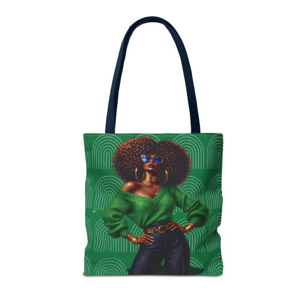 Carry a confident, modern statement with this Afro-chic tote. The vibrant green canvas is alive with bold African patterns and the silhouette of an Afro fashionista—an accessory that feels like walking art. It settles comfortably on your shoulder, ready for market runs, library stops, or creative commutes. The roomy boxed corners and reinforced handles mean it moves with your day: groceries, sketchbook, or laptop slip in without a fuss. The look speaks to heritage and style, inviting knowing glances and quiet compliments while blending seamlessly into city streets, weekend festivals, or cultural gatherings.
